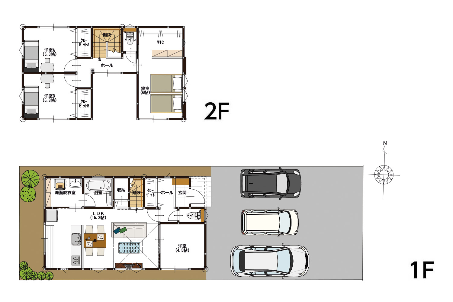 リビング勾配天井、トップライト1階洋室!大型WIC完備!2階トイレ
